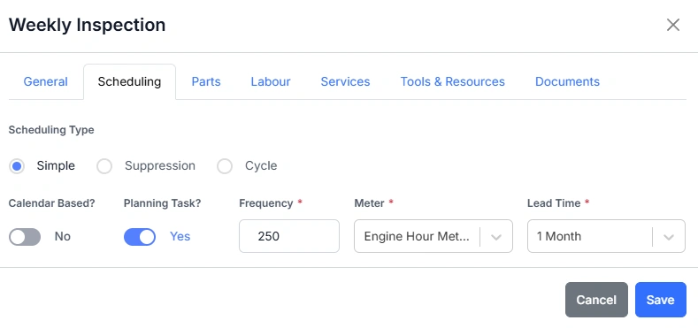 | Calendar Based | Toggle Yes to schedule by time (e.g. every 30 days), or No to schedule by usage (e.g. every 1000 hours). |