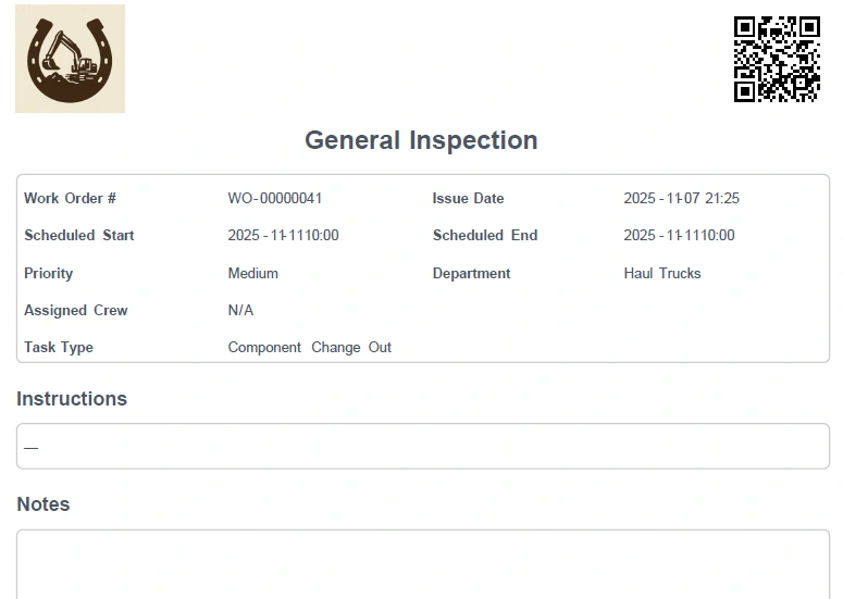 Work Orders can be exported as a PDF and printed.