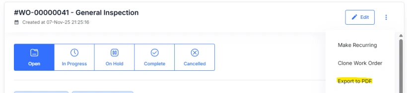 - Select Export to PDF from the drop down menu in the top right of the Work Order