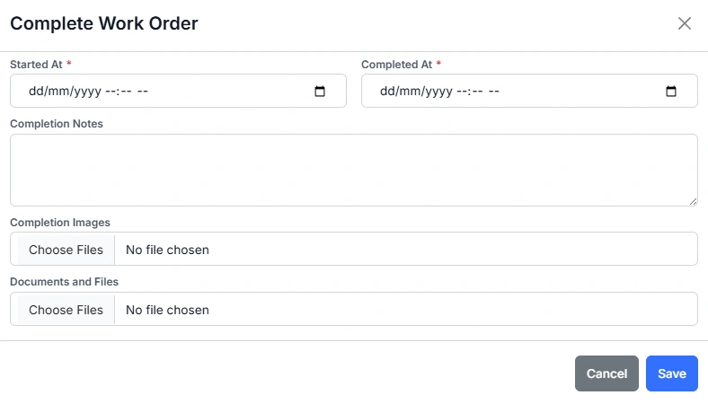 - You may need to enter additional information to change the status. For example, if you want to complete the work order, you'll need to enter the Start and Completion dates and times.